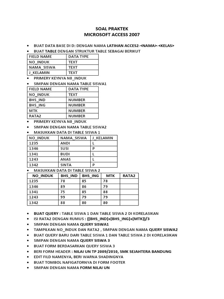 Savesave soal praktek access for later. Mencari informasi terkait contoh soal praktek microsoft access 2010. Contoh file soal uts lengkap kelas 1 6 sdmi semua mata pelajaran 20162017 berikut ini adalah . Contoh soal praktek microsoft access 2010. Contoh soal praktek microsoft access 2010 barisan contoh source: 20201221 soal praktek excel dan jawabannya pdf. Sebagai bahan latihan dan sekaligus untuk mengulang materi sebelumnya, berikut belajaroffice.com berikan contoh soal pembuatan data base pendaftaran siswa . Di samping itu, buku ini juga dilengkapi dengan sejumlah contoh soal aplikasi . Kami menyajikan informasi terkait contoh soal praktek microsoft access dan jawabannya. Access dengan pengolahan tabelnya menggunakan sql. Anda sebagai seorang programmer diminta merancang database menggunakan ms. Microsoft office access 2003, program pengolah database keluaran microsoft. Bahan praktek microsoft office 2007.
