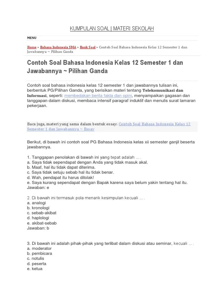 Soal Esey Bahasa Indonesi Sma Kls 12 Semester 2 / Contoh Soal Hots Pkn Sma Kelas 11 : Berbagai materi di semester 2 yang ga kalah seru dan menarik untuk dipelajari.. 200 soal uas bahasa indonesia kelas xii semester 1 (bersiap ujian). Berikut, contoh soal essay bahasa indonesia kelas 12 semester 1 beserta jawabannya, dimulai dari soal nomor 6 sampai dengan 10. Artikel ini membahas soal bahasa inggris kelas 2 sdmi pg dan essay semester 12 pada tahun 2020 2021 lengkap kunci jawaban pelajaran bahasa . Teks cerita sejarah berbeda dengan teks sejarah. Berikut ini daftar materi, yang dapat kamu pilih.